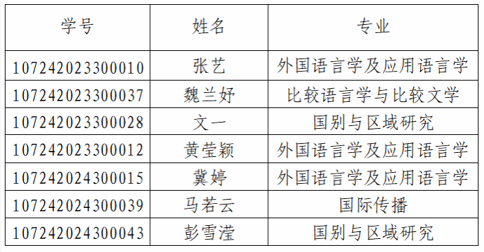 根据《西安外国语大学研究生国家奖学金评审实施细则(2022 年修订)》(西外发〔2022〕64号)、《2025年博士研究生奖学金评定细则》的相关规定,经学生自主申报、资格初审、材料审核、督导复审、学院评议等环节,评选出2025年博士研究生国家奖学金获得者7人。现予以公示: