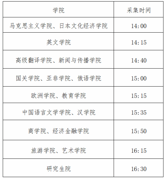 3.各培养学院应指定专人负责毕业生图像信息采集工作的组织安排,提前10分钟在文体馆北门门口集合,服从工作人员指挥,确保采集工作顺利进行。各培养学院应于10月20日前将现场带队老师姓名及电话通过OA发送至研究生院乔丹雯邮箱。