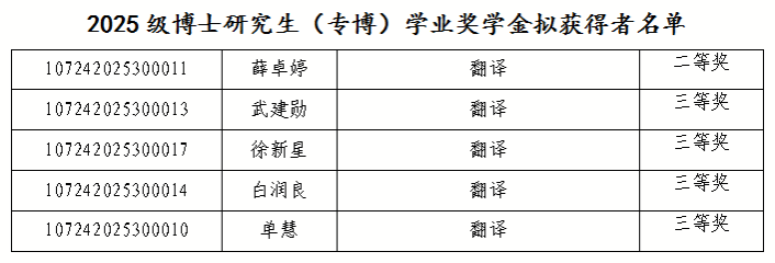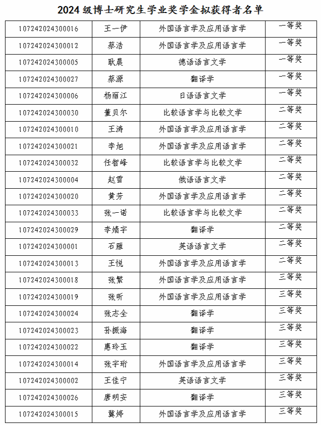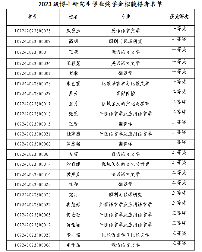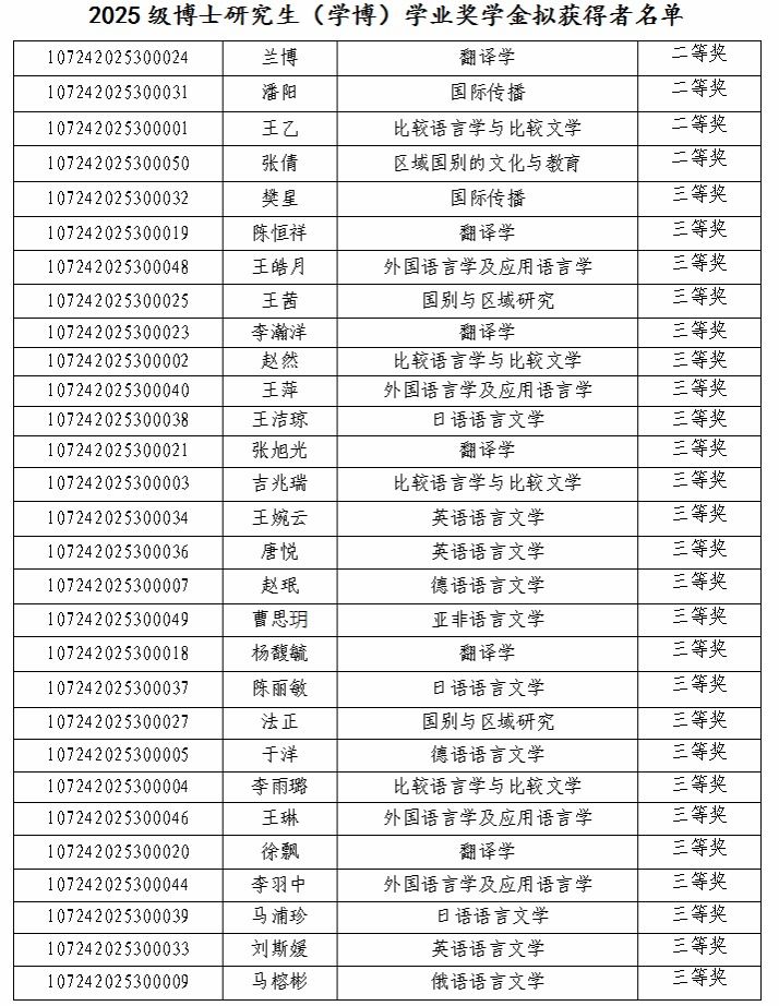 根据《西安外国语大学研究生学业奖学金评审实施细则(2022 年修订)》(西外发〔2022〕67号)、《2025年博士研究生奖学金评定细则》的相关规定,经学生自主申报、资格初审、材料审核、督导复审、学院评议等环节,评选出2025年博士研究生学业奖学金拟获得者80人。现予以公示: