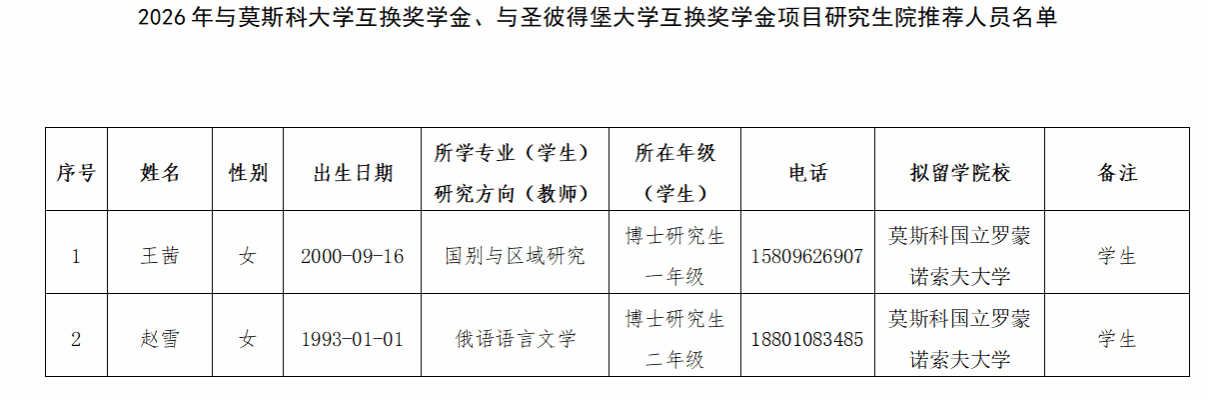 根据我校国际合作与交流处《关于启动2026年与莫斯科大学互换奖学金、与圣彼得堡大学互换奖学金遴选工作的通知》要求,经个人申请、条件审核,拟推荐博士研究生赵雪、王茜申报与莫斯科大学互换奖学金项目